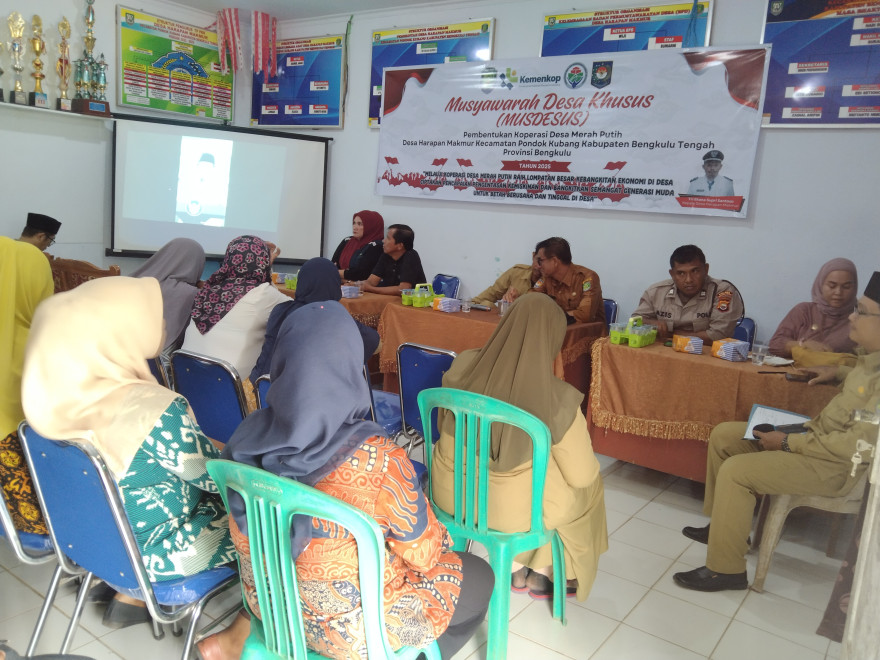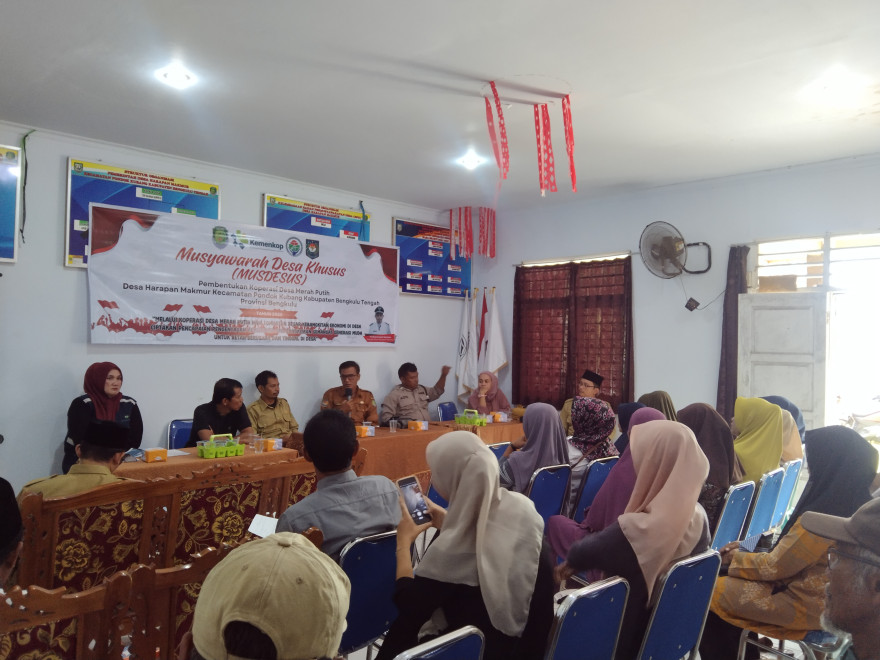 Harapan Makmur, 19 Mei 2025 telah dilaksanakan Musyawarah Desa Khusus ( Musdesus ) pembentukan koperasi merah putih Desa Harapan makmur . Musdesus ini diselenggarakan oleh Badan Permusyawaratan Desa ( BPD ) Desa Harapan makmur yang bertempat di ruang rapat kantor desa harapan makmur. Kegiatan ini dihadiri oleh DPMD Kabupaten Bengkulu tengah, Dinas Koperasi Kabupaten Bengkulu tengah, Camat kecamatan pondok kubang, Pendamping Desa, Perangkat desa, Adat desa, Babinsa, Babinkamtibmas, dari unsur Kesehatan, Pendidikan, Pertanian, dan Masyarakat Desa. Antusiasme masyarakat tampak tinggi saat pembentukan pengurus dan pengawas koperasi yang nantinya akan fokus mengelola usaha strategis seperti gas elpiji, pupuk, dan pembelian hasil pertanian. Tujuan dilaksakannya Musdesus ini untuk menindaklanjuti Intruksi Presiden Nomor 9 Tahun 2025 tentang Percepatan Pembentukan Koperasi Merah Putih. Acara diakhiri dengan penandatanganan Berita Acara pembentukan pengurus koperasi merah putih. Dari hasil musyawarah, sudah ditetapkan susunan pengurus mulai Ketua, Wakil Ketua Bidang, Sekretaris, Bendahara hingga pengawas," ujarnya, Senin (19/5) Sektor usaha yang akan digarap adalah pembuatan gudang pupuk dan logistik, klinik dan juga simpan pinjam, ketiga opsi di atas di dasarkan pada potensi hasil pertanian yang ada di desa yaitu perkebunan sawit. Hasil pertanian ini diyakini bisa mampu mendorong ekonomi desa menuju lebih baik. Setelah pembentukan pengurus, Pemerintah Desa mendorong koperasi segera dibentuk secara hukum melalui notaris. Koperasi Merah Putih diharapkan menjadi model pemberdayaan ekonomi berbasis gotong royong yang memperkuat struktur ekonomi desa di Kabupaten Bengkulu tengah